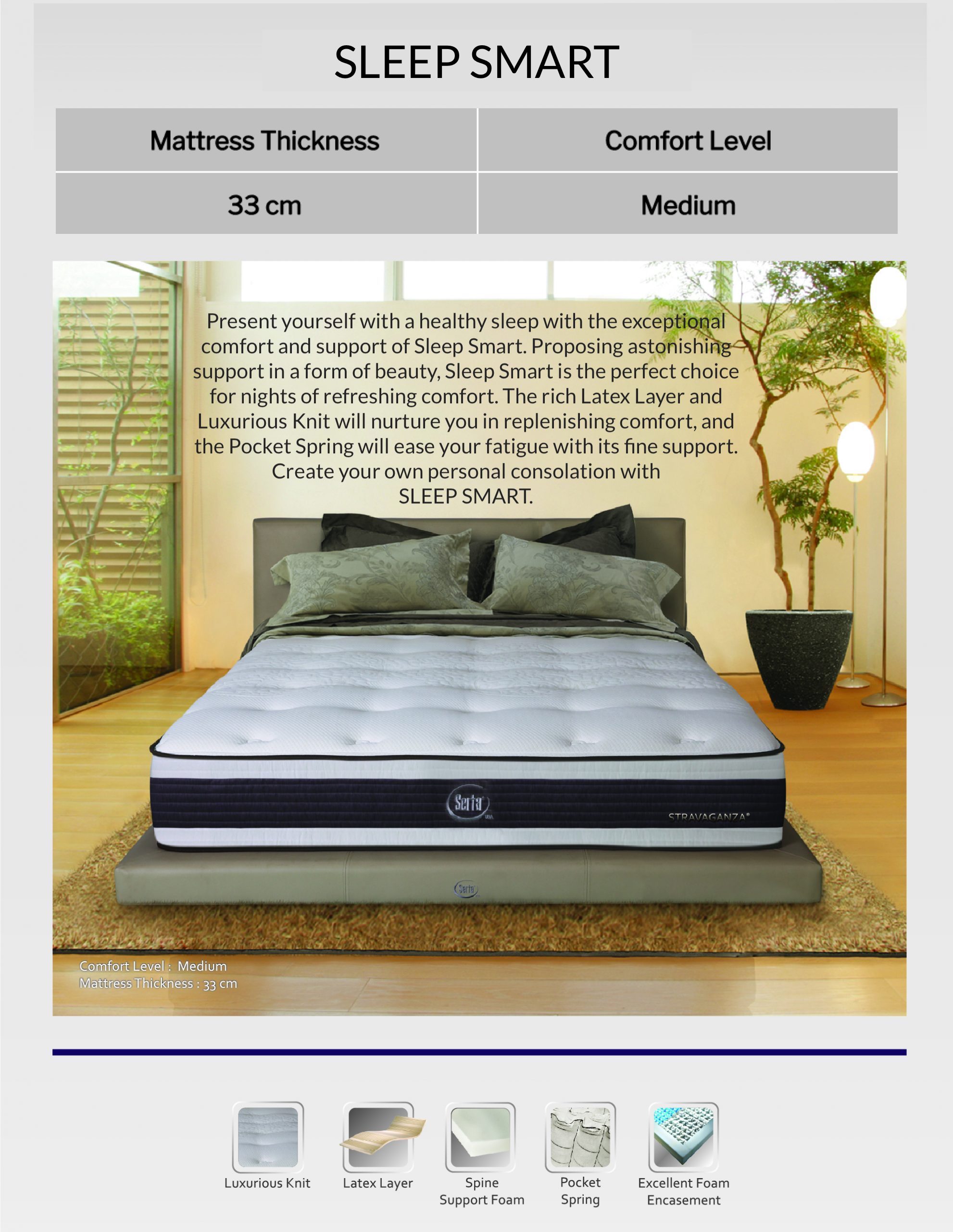 *CLEARANCE* SLEEP SMART Mattress (13 inch), Serta Perfect Spine Collection, Latex Top 5-Zone Pocket Spring, Available Sizes (King, Queen, Super Single, Single)