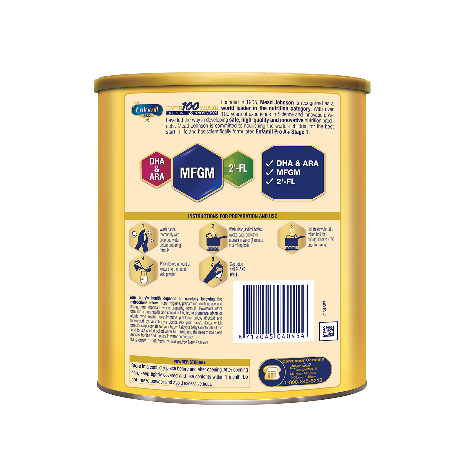 - With over 100 years experience in paediatric nutrition, Mead Johnson Nutrition has designed Enfamil A+ Stage 1. this is a patented formula in US, Europe, Malaysia, Singapore and Hong Kong.