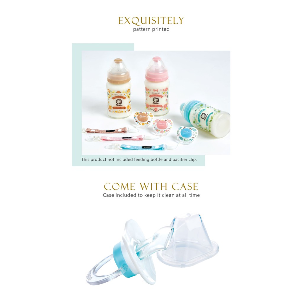 ●Feature1.Made of food grade silicone, SGS certified all parts are BPA Free. 2.Thumb type is suitable for the shape of baby’s jaw and teeth.3.It store hygiene with case, avoid to stains. ●MaterialPacifier:Silicone (-20℃~+120℃)Pull ring:Tritan (-20℃~+100℃)Plastic sheet‧Plug‧Case:Polypropylene (-20℃~+100℃)