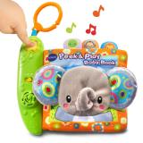 The Peek & Play Baby Book™ by VTech® is a real page turner! The soft book pages introduce adorable animals through bold pictures and fun interactive features. The cover has a cute elephant with crinkly ears, and each page plays sing-along songs, sound and phrases. Lift the fabric flaps on the pages for fun peek-a-boo surprises. Press the three fabric buttons to meet friendly characters and learn about animals, colors, objects and play songs. Take the infant book on the go and attach it to car carriers and more using the plastic ring. It’s the perfect first book for your baby!