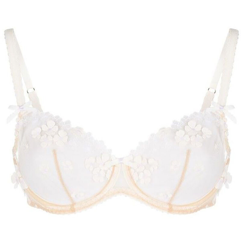 our gloriously persuasive bethanie range, ravishing yet refined, returns for the new season in an updated design. ideal bridal lingerie, this underwired bra features a sheer tulle base, revealing the tone of your skin beneath it. across the cups are scattered 3d daisies in a soft pastel blue shade with coral accents against a base of french embroidery. matching picot bows decorate the apex and the centre, with amber-coloured darting and trim to the cups creating a defined, enhanced silhouette.