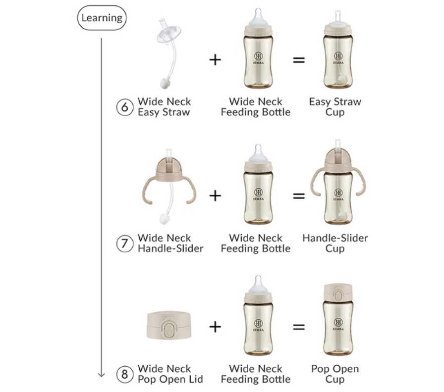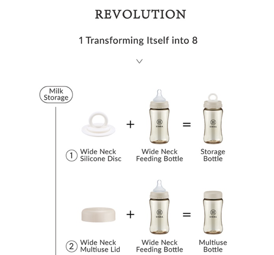 ● Pioneering! 1 Transforming Itself into 8 - Simply change the upper parts according to the need for milk storage, feeding or learning at every stage of nursing the baby.