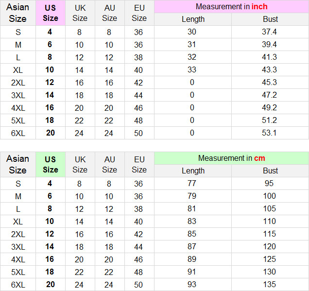 6XL (US20 UK24 AU24 EU50): Length 93cm; Bust 135cm;