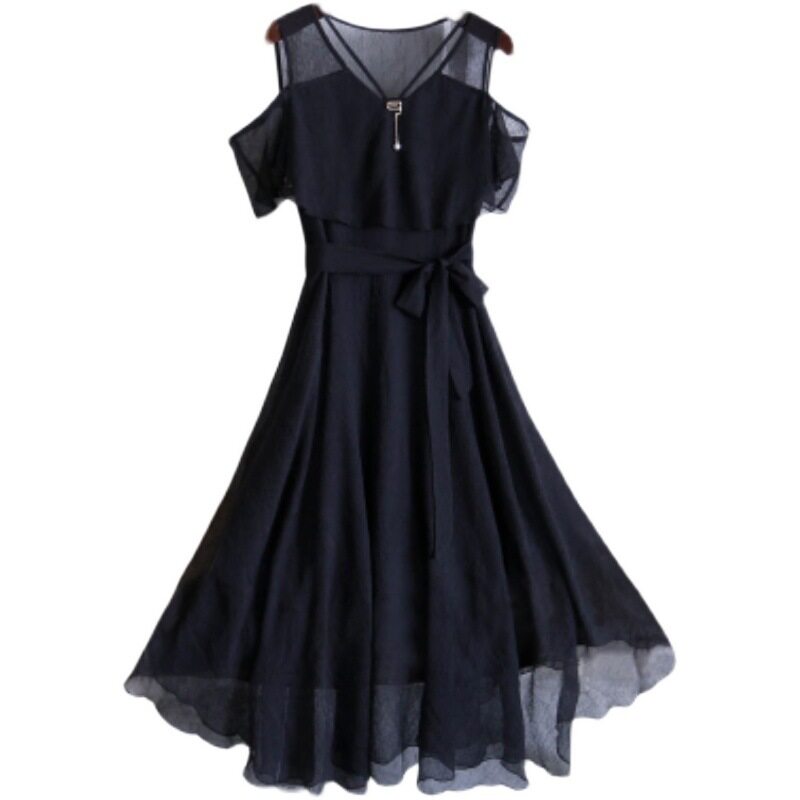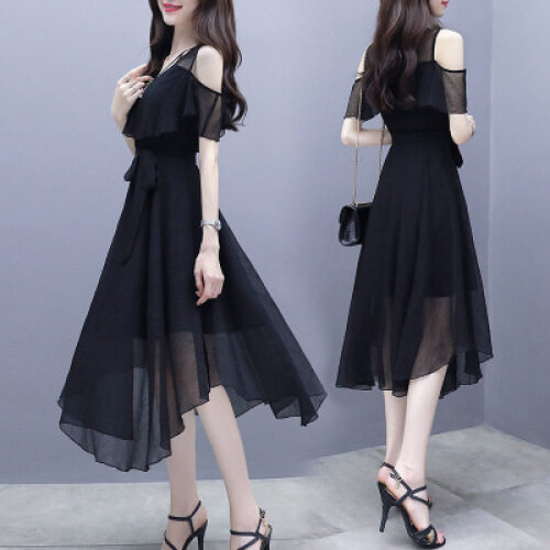 Korean Style Women Casual Midi Dress Chiffon Summer Short Sleeve Dresses Ladies