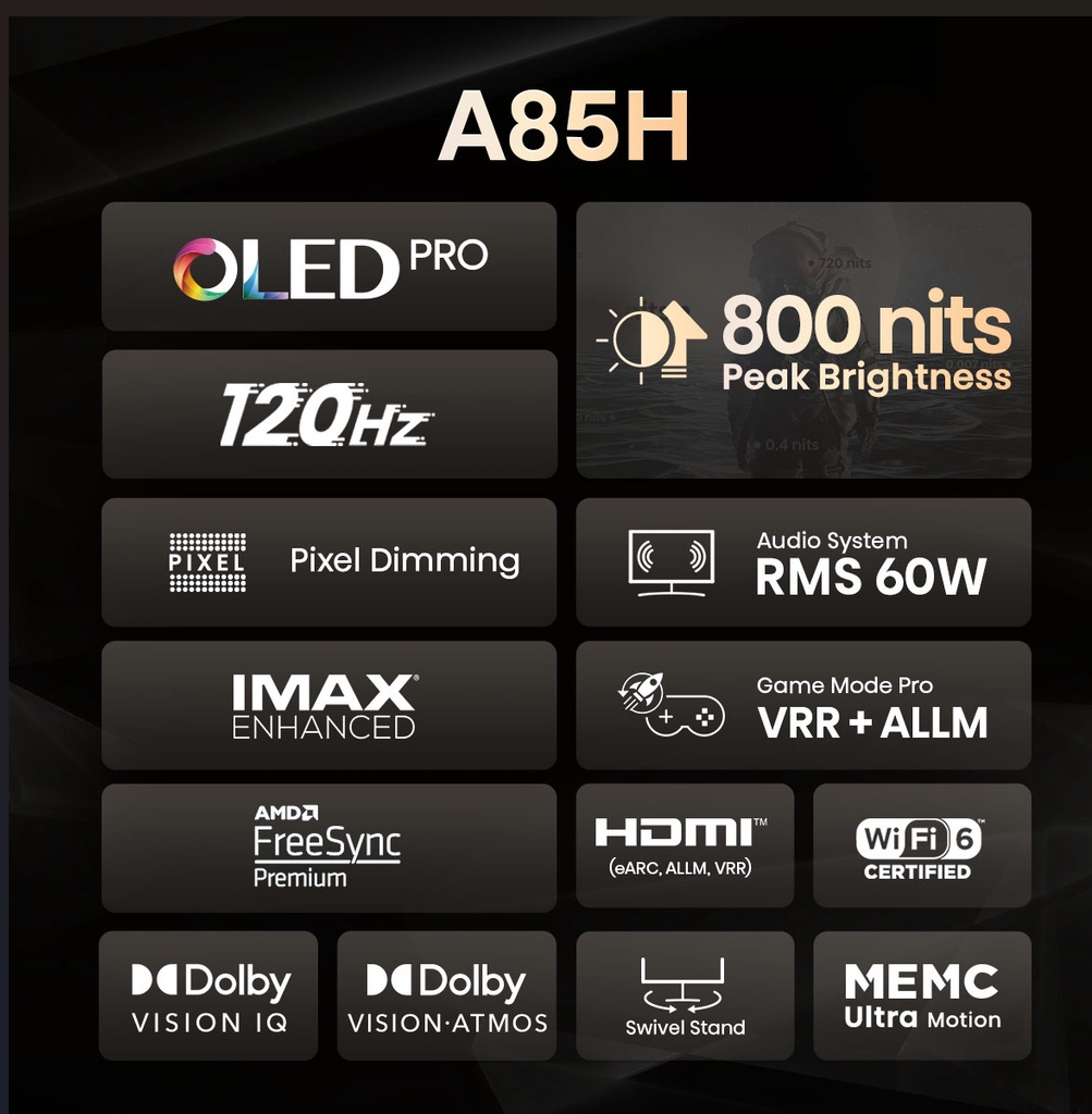Hisense A85H OLED Smart TV 55 inch | 120Hz Native | Dolby Vision IQ & Atmos | HDR 10+ | 60W audio system | IMAX Enhanced | HDMI 2.1 (eARC) | Wifi 6 | ADM FreeSync Premium | MEMC VRR ALMM | Filmmaker m