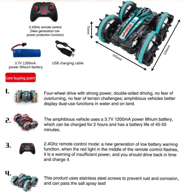 * Surfing on the Water - Yes, you read that right. Incredible,this remote control car can really run in your pool , sea and snow. Completely waterproof design, can do what all the common stunt car do and what they can’t.