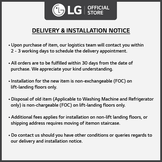 - Damaged/faulty item(s): This return reason requires approval from an LG technician. Please contact us via platform chat to arrange an onsite check before raising your request. If you raise return without a valid diagnosis from the technician, your request will be rejected until the process is adhered to.