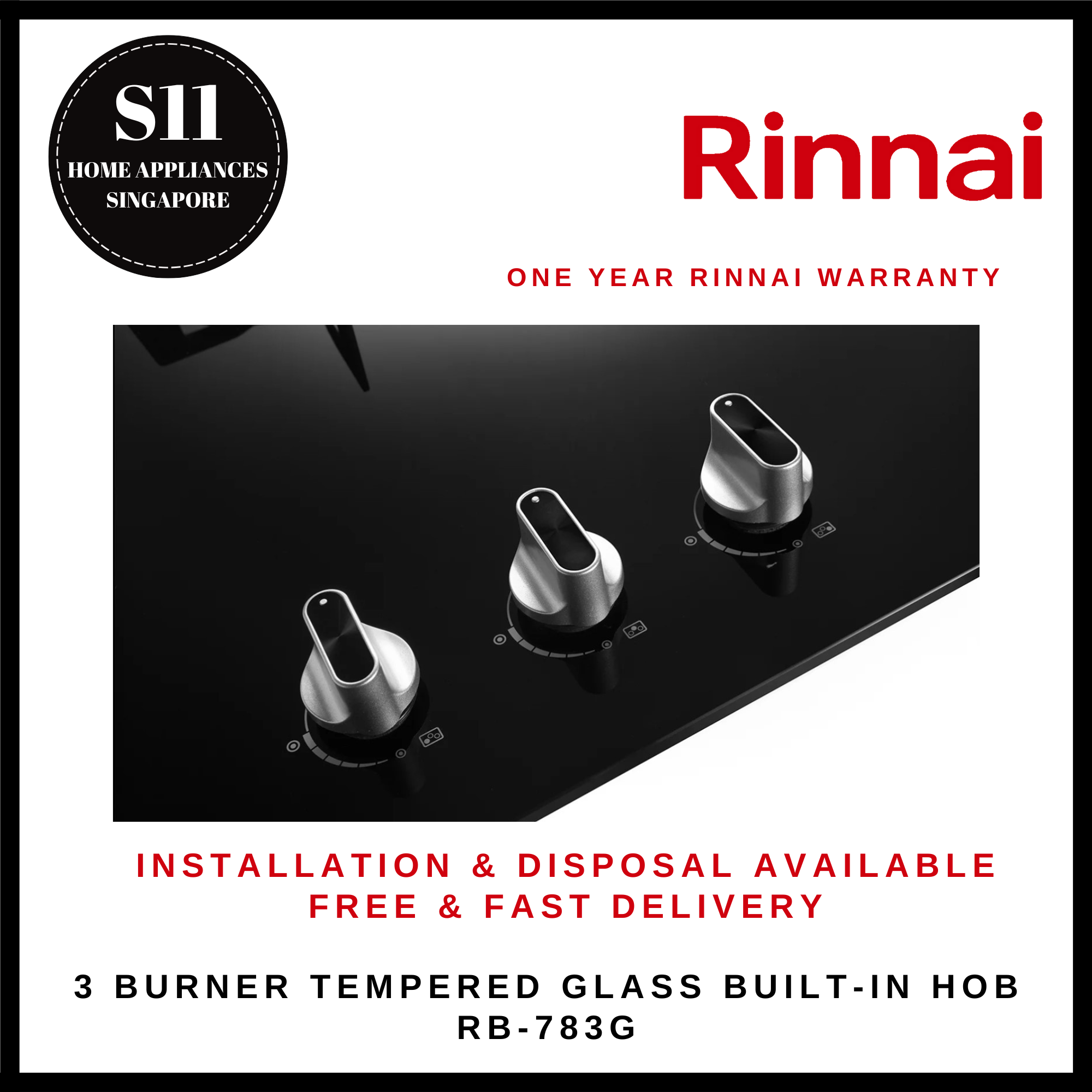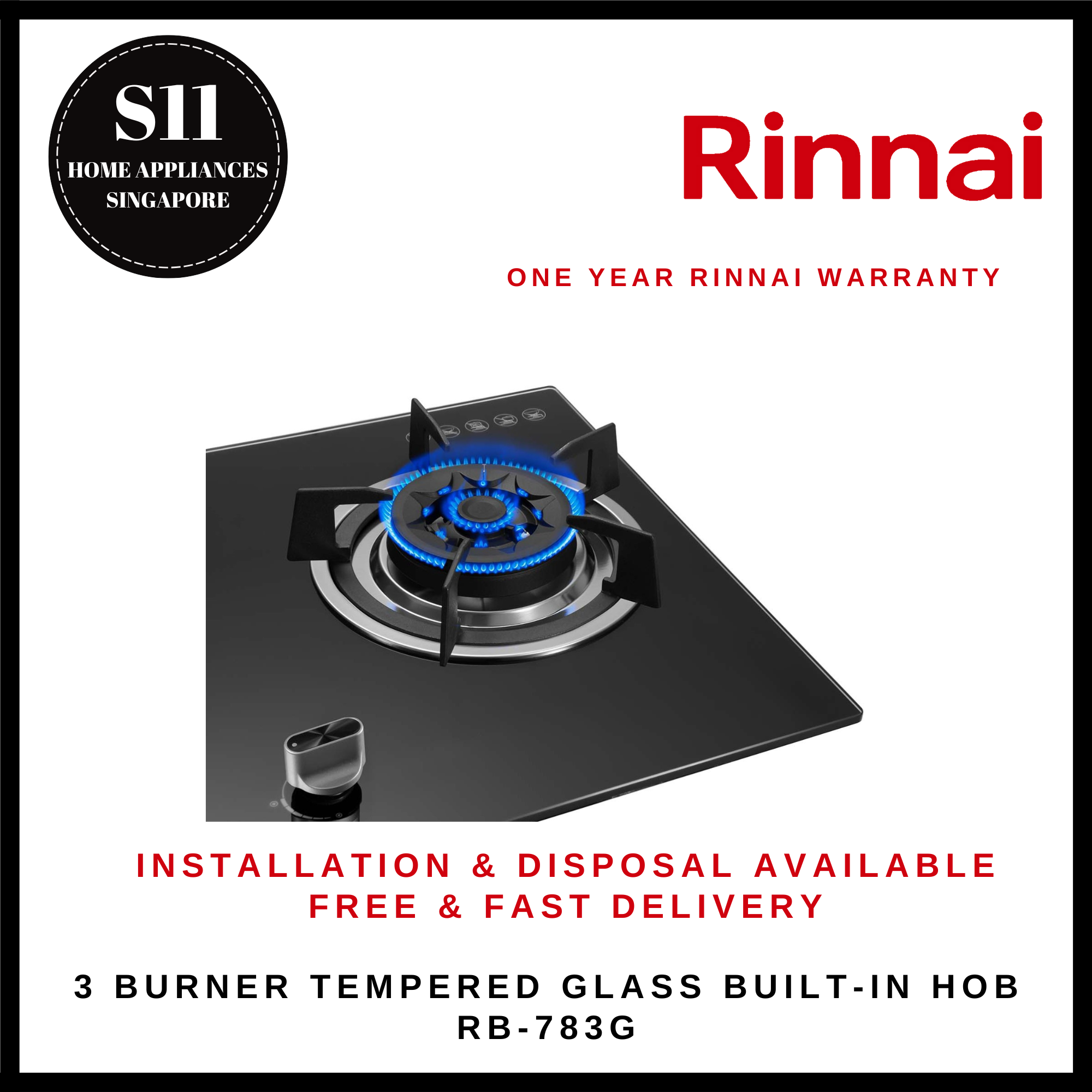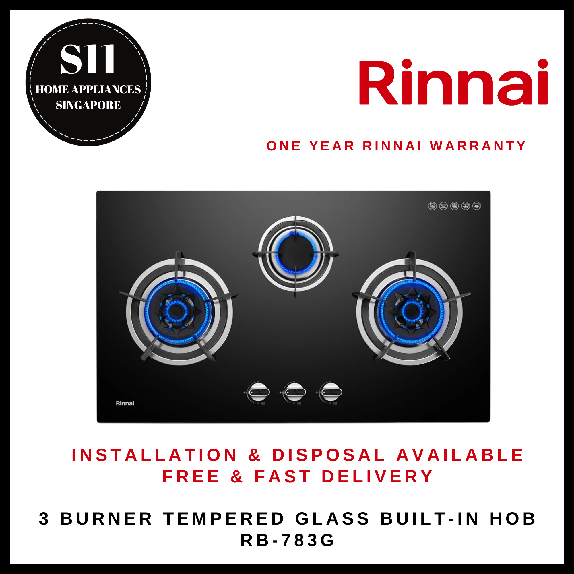 RINNAI RB-783G 3 BURNER TEMPERED GLASS BUILT-IN HOB - READY STOCKS & DELIVER IN 3 DAYS