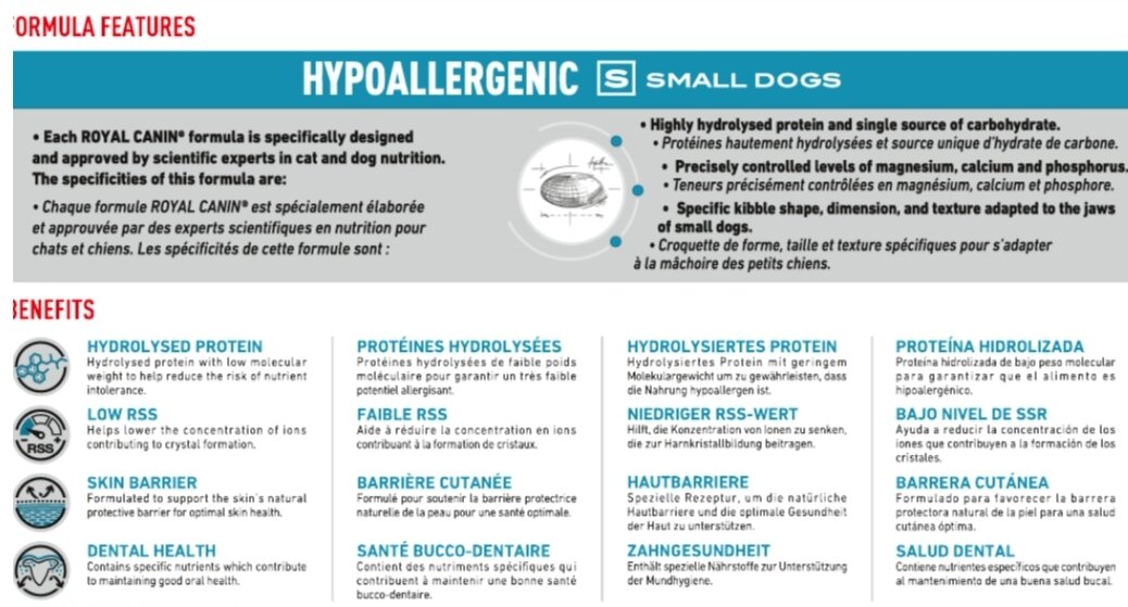 The ROYAL CANIN® HYPOALLERGENIC SMALL DOG dry food, designed for adult small breed dogs weighing under 10kg, is a comprehensive therapeutic diet specifically developed to minimize sensitivities to ingredients and nutrients. It contains carefully chosen protein and carbohydrate sources to address intolerance issues effectively.
