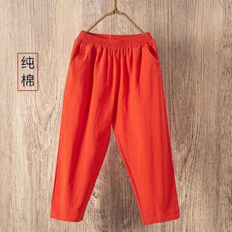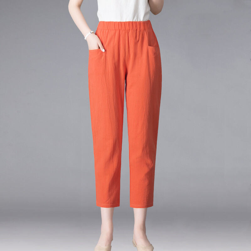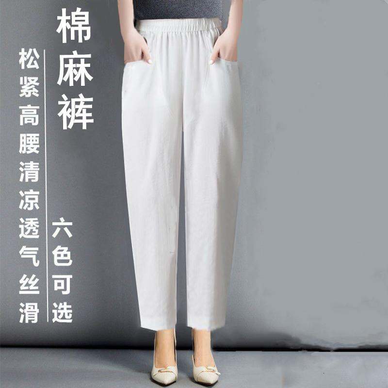 Thin 2024hc Pants Straight-leg Middle-Aged and Elderly White Waist Summer Women's Pants Harem Cotton Linen Loose Ladieswear Break Trousers with an Elasticated Waist