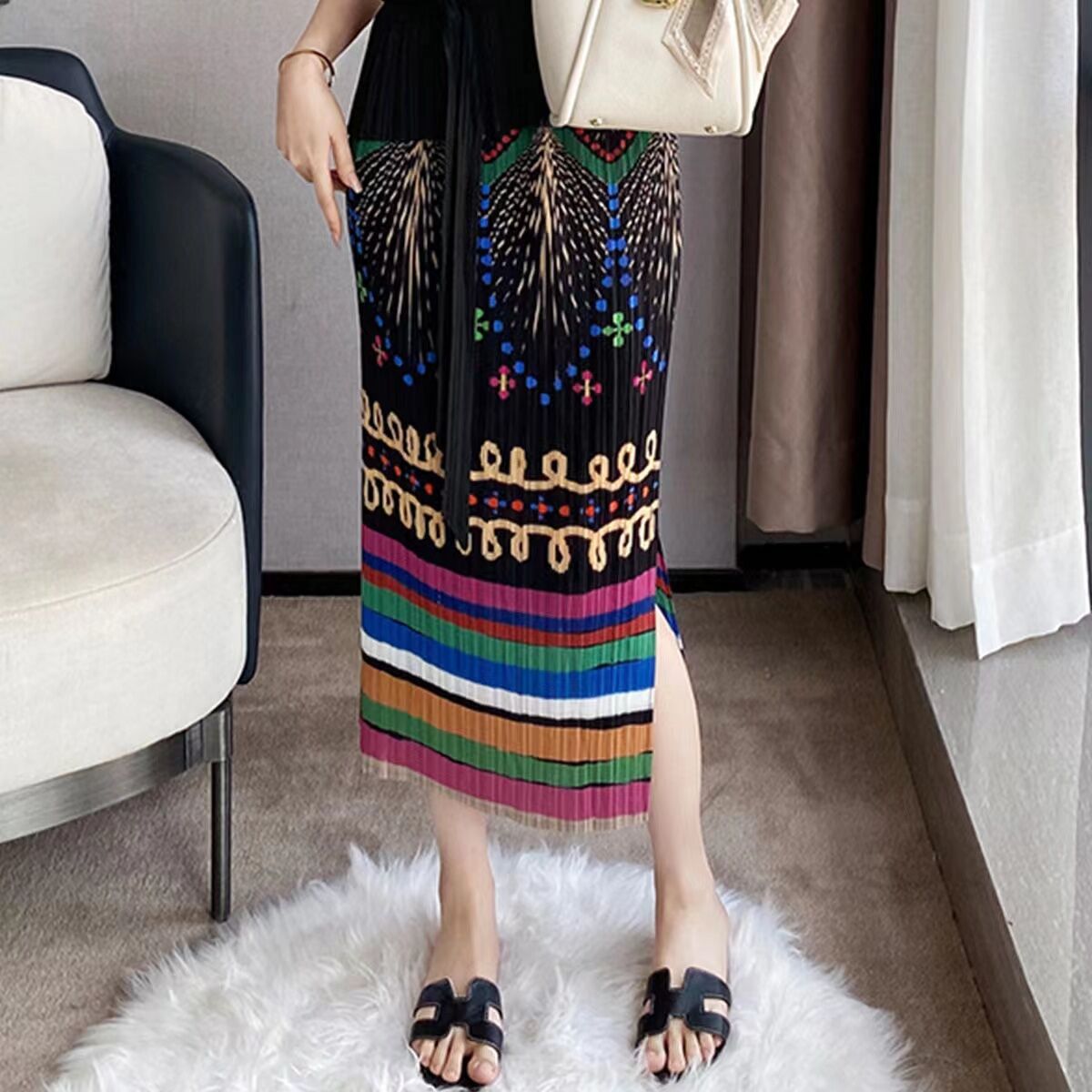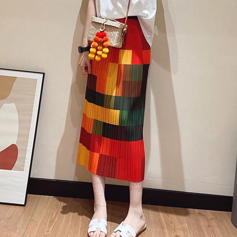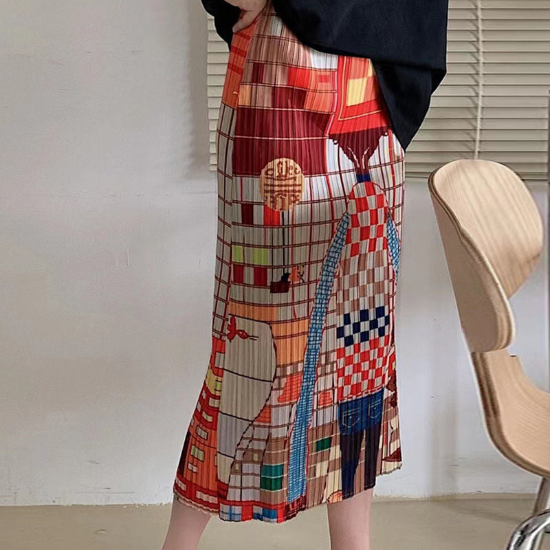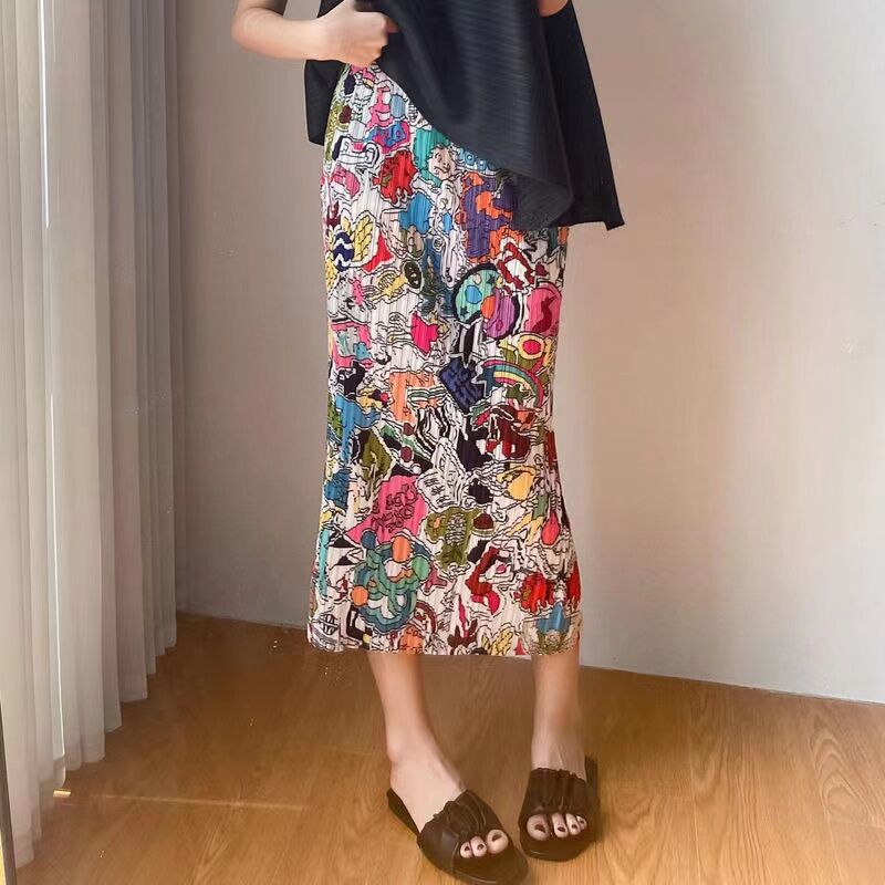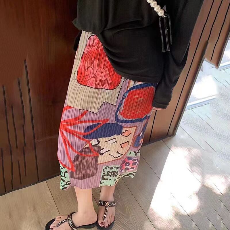 Pleated Skirt a-Line Slit Midi Skirt Women's Summer Thin High Waist Loose and Slimming Pleated Skirt Floral Skirt