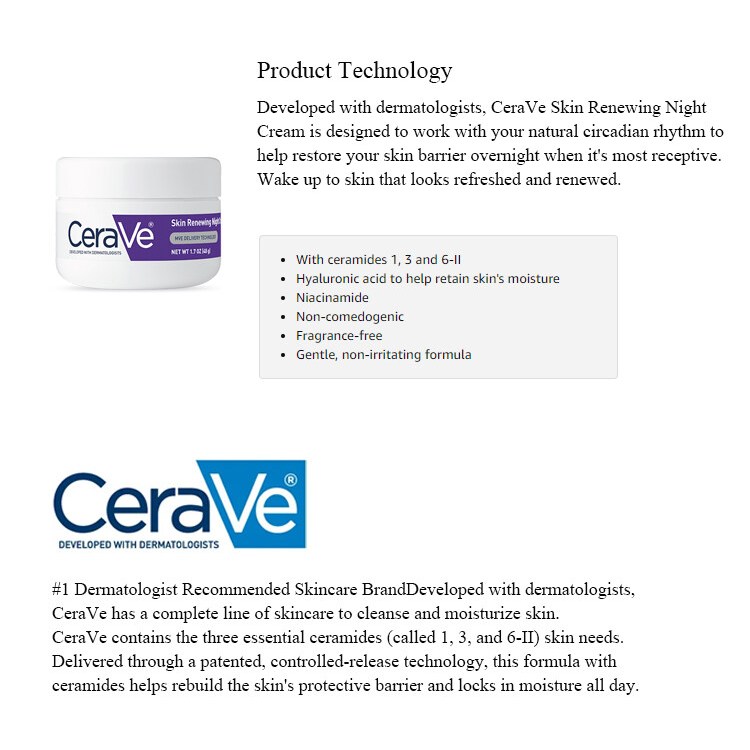 Product Description: Nighttime is the skin’s chance to help renew itself, and a properly formulated night cream provides hydrating and rejuvenating benefits. We recommend looking for formulas designed with hyaluronic acid, niacinamide and ceramides to hydrate, calm and restore the skin barrier, like our CeraVe Skin Renewing Night Cream, which also features peptides to help improve the appearance of fatigued skin. Suitable for all skin types, CeraVe Skin Renewing Night Cream features a complex of biomimetic peptides, hyaluronic acid, and 3 essential ceramides that work together to lock in skins moisture and help restore your skin’s protective barrier overnight. Our non-greasy, intensely moisturizing skin renewing night cream is designed to soften and renew the look of tired skin, and our patented MVE technology encapsulates ceramides to ensure efficient delivery within the skin’s barrier and slow release over time. Supporting your protective skin barrier, long after you’ve finish applying —so you can wake up looking rested and rejuvenated. ⭐Benefits: • Helps soften and renew the look of tired skin overnight • Provides intense hydration • MVE Technology: This patented delivery system continually releases moisturizing ingredients for all night hydration • Biomimetic peptides: Improve the appearance of tired-looking skin • Ceramides: Help restore and maintain the skin’s natural barrier • Hyaluronic acid: Helps retain the skin’s natural moisture • Niacinamide: Helps calm the skin • Non-comedogenic and fragrance-free • Developed with dermatologists.