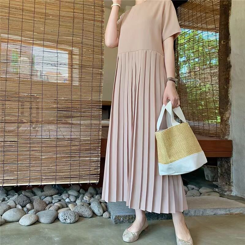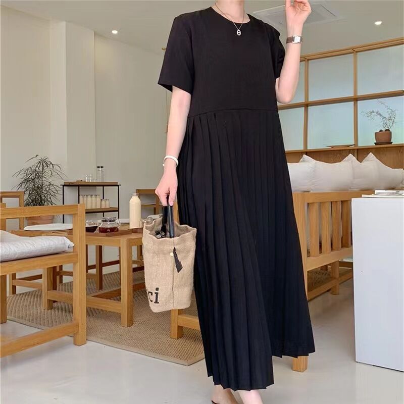 2024 Summer New Arrival K-style Loose Slim Looking Short Sleeve Chiffon Pleated Dress Female Long below the Knee Casual Dress