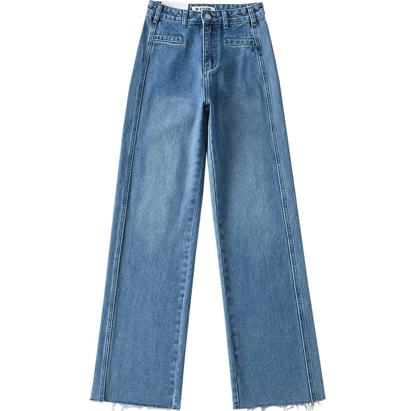 Cotton Ocean European and American Beauty Bloggers Retro High Street Style Loose Pants Patchwork Raw Hem High Waist Straight Mop Denim Trousers for Women