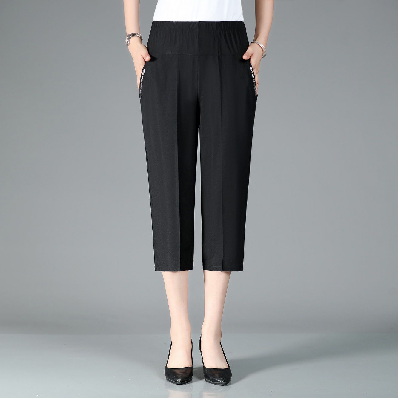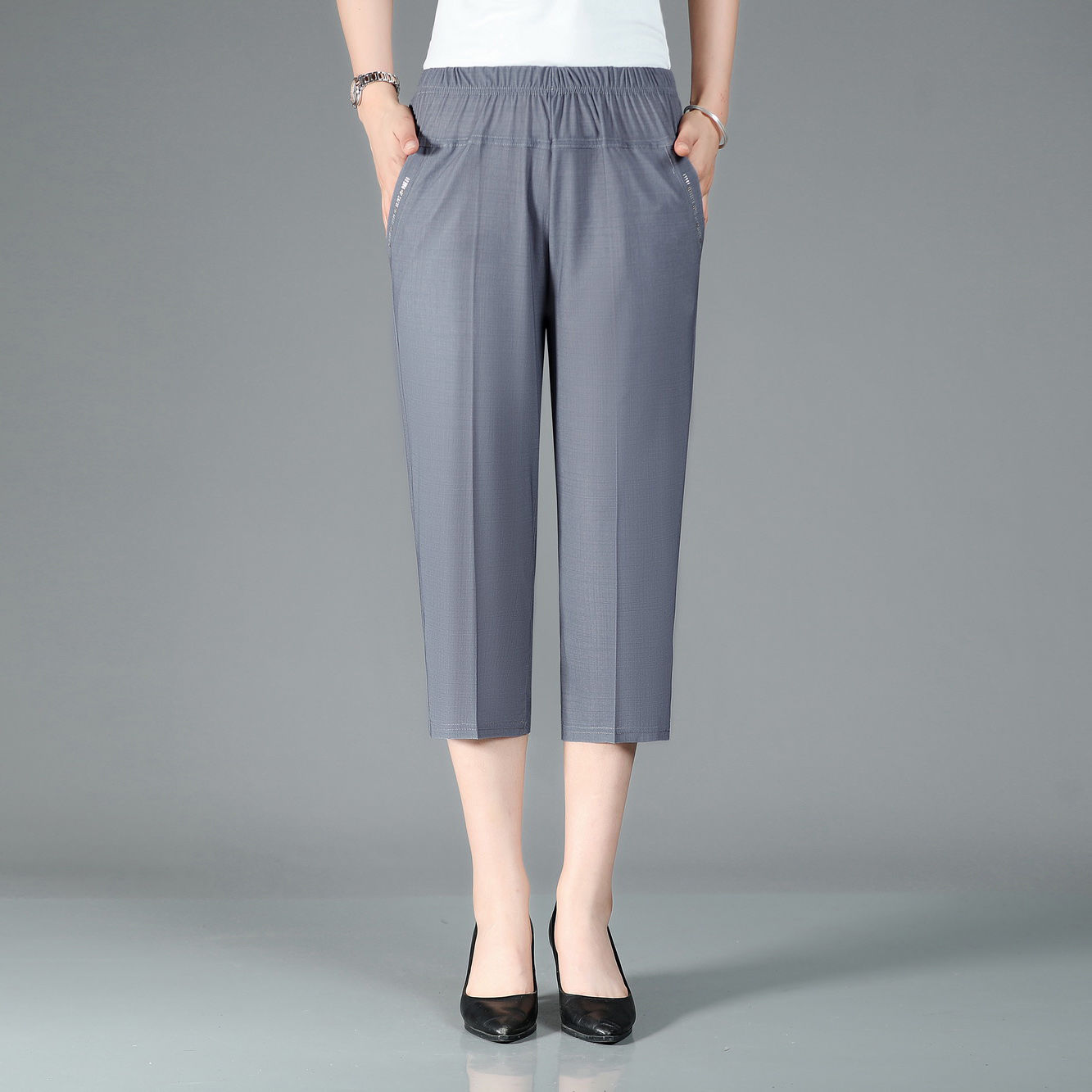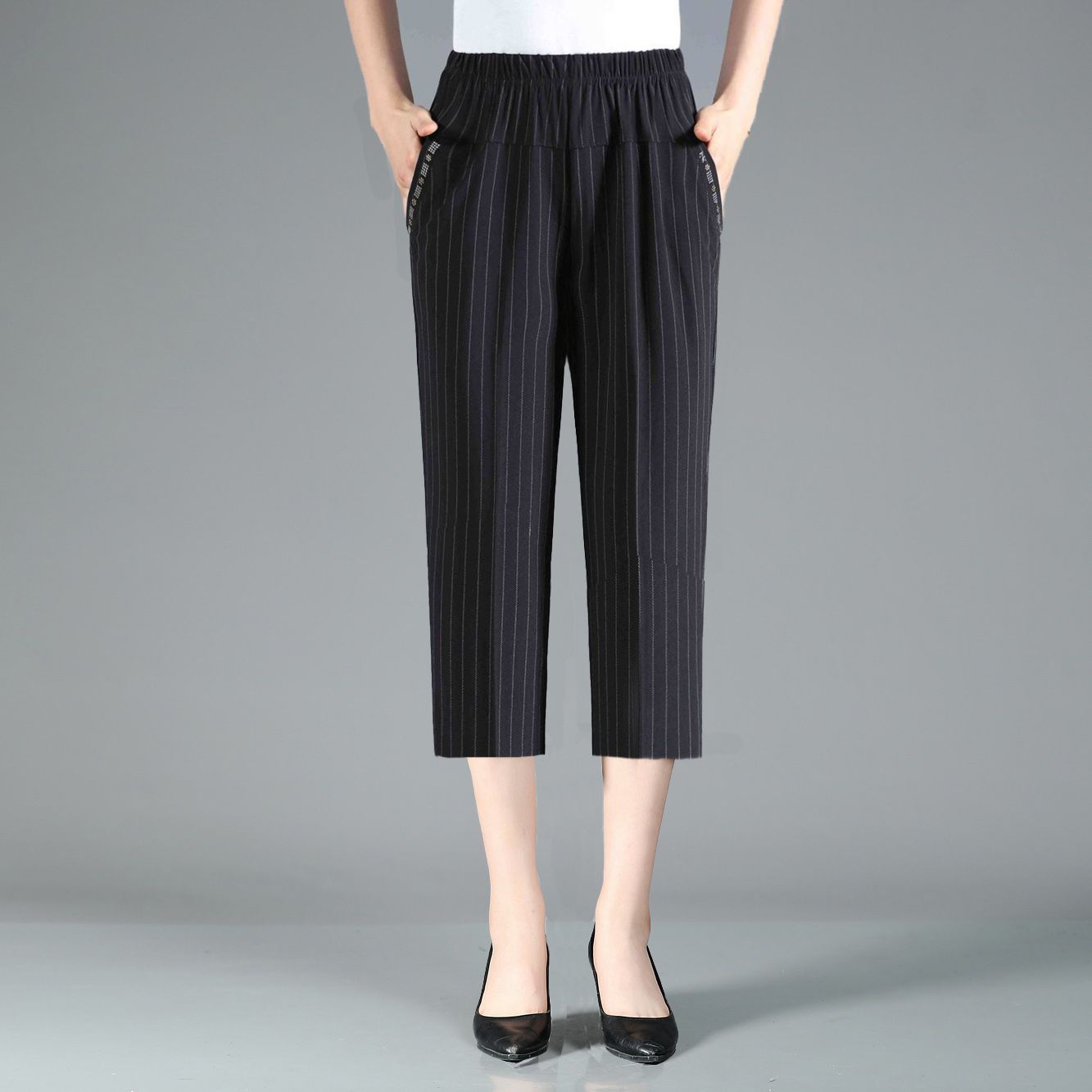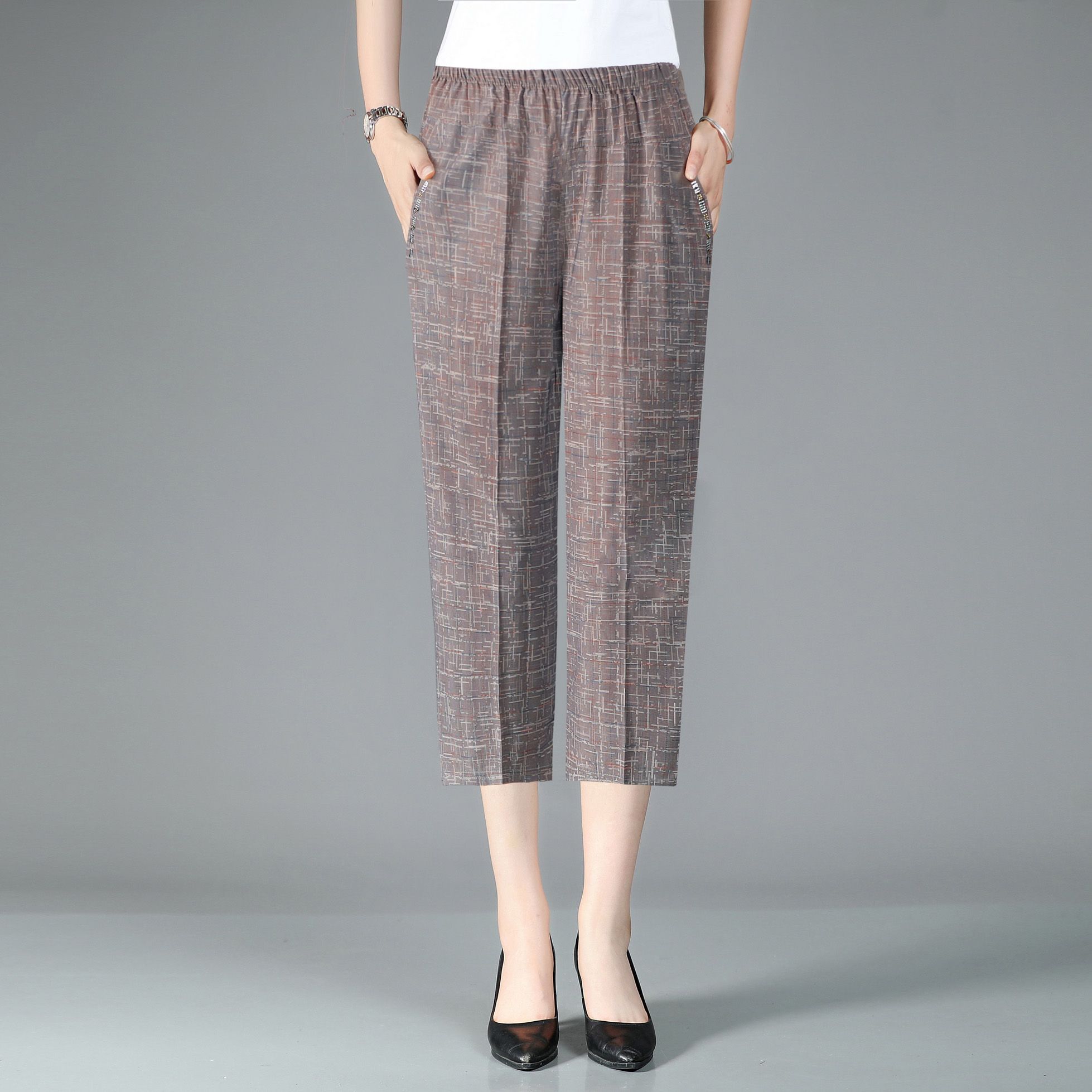Women's High Waist Elastic Mom Loose Large Middle Aged 7/4 Pants
