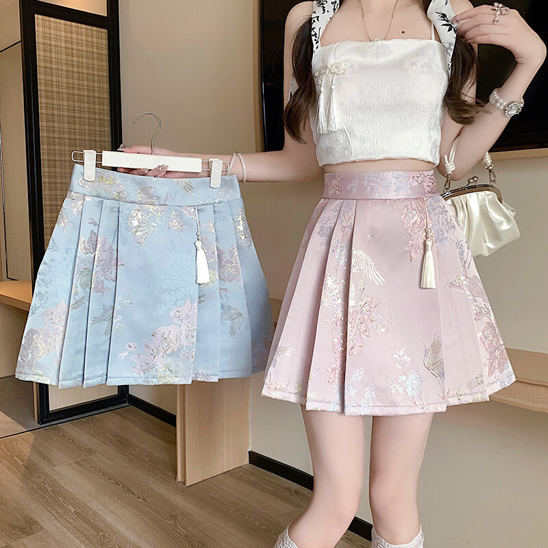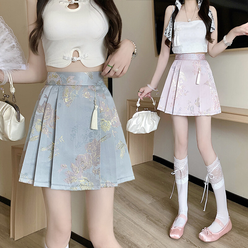 YIGE High end satin jacquard horse face skirt 2024 new Chinese style half skirt for women with small stature and pleated short skirt