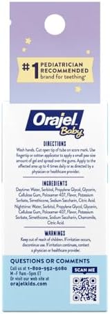 HELPS CALM, RELAX AND SOOTHE: Our instant cooling sensation works wonders on infants who may be teething, upset, cranky or fussy – day or night. DRUG-FREE: Free from benzocaine, belladonna, eugenol, sugar, menthol, sodium lauryl sulfate (SLS), sulfate, dairy, and artificial colors, dyes, and sweeteners. SAFE AND GENTLE FORMULA: Both our daytime and nighttime cooling gels are easy-to-use at home or away. #1 PEDIATRICIAN RECOMMENDED: Trust the professionals who trust Orajel Baby. STAGE 1 FOR AGES 0+: Orajel Kids Stage 1 Teething and Tooth & Gum Cleanser products are appropriate for ages 0 and up. #297 in Baby ( ) #3 in