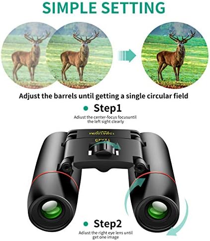 Lightweight Small Binoculars: You can throw them into your backpack each day without hesitation. The mini pocket binoculars are totally worth the tiny amount of weight they add to your pack. Compact Binoculars Clear vision: 12x25 optics binoculars with a 12X magnification and objective lens diameter of 25 mm, What's more is with the large field of view-126ft/1000 yards, you can see the entire visual field for capturing objects easily. Easy on Focus: Just adjust by Smooth "center-focus knob" and right eye lens. The folding binoculars suitable for both adults and kids binoculars. Compact Binoculars with BAK4 prism which can 100% reflect the light to keep a good image (while don't forget to adjust the knobs to fit different view distance), made of Mg body and hand figured polishing. Application: Perfect for adults, kids, concerts, theater, opera, plays, shows, travel, hiking, camping, sport events, bird watching , etc. The binoculars come with their own neck strap, cleaning cloth and carrying bag.