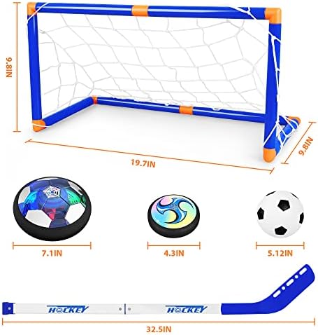 Valuable Hover Hockey Set for Kids: Includes 2 rechargeable hover soccer balls, no need batteries,1 inflatable soccer and 1 inflatable basketball, inflate the ball with the pump,2 hockey sticks, 2 goals and 1 rechargeable cable, a Mini Screwdriver Special Design and Easy to Assemble: The hover ball has multi-color LED lights built in, which can enhance the feeling of fun, This brilliant light can easily grab children's attention and keep them occupied for hours. Multiplayer Game and Enhance the Relationship: Powerful fan floats allow the ball can slide on any flat floor perfectly, including hardwood floors, tile floors, basements, and even low-pile carpets, Kids can not only play with hockey toys but also play them as ice hockey, knee basketball set, soccer hover ball, soccer toys, Kids can also compete with friends and parents to enhance the relationship. Ideal gift: Color packaging, Develop sports skills, collaborative games and social skills, rovide time for enjoyment and exercise for kids.The best choice for children's birthday gifts or Christmas gifts.Suitable indoors or outdoors, perfect for children to enjoy the perfect holiday. ⚽? The hover soccer set for kids allows kids to play in various ways as it glides perfectly on any smooth surface. Kids can play them as hockey toys, soccer hover balls, soccer games, and bowling ball games. In twos or as a multiplayer practice kickback toy with their dog. Excellent soccer games for toddlers 3,4,5,6,7,8 etc