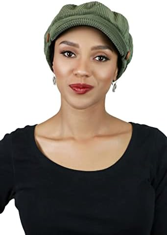BRIANNA CABBIE NEWSBOY CAP FOR WOMEN OLIVE GREEN CORDUROY is a cute, retro chic, fall and winter hat that's perfect for cancer patients and women with medical hair loss. A great choice in chemo headwear LOVE BRIANNA'S CORDUROY CABBIE CAP IN OUTLANDER? Get the look with this cute wide wale corduroy cabbie hat. 6 pie-shaped sections on top and a button accent or either side FULLY LINED FOR COMFORT WITH FULL COVERAGE over the ears and neckline makes this classic fall cabbie or Gatsby hat a perfect chemo hat for women. Will not slip on a bald head COVERED ELASTIC AT THE NECKLINE FOR A SECURE FIT as a chemo cap for women with medium size heads, 22 inches to 23 inches as measured around the hair line THE SHORT 2 INCH BILL is nicely curved to frame your face without being overpowering. A cute fall fashion women's hat. Fully lined. 100% cotton #407,055 in Clothing, Shoes & Jewelry ( ) #121 in
