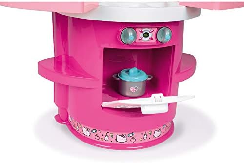 Hello Kitty Toy Kitchen Designed in Bright Pink and White Colors and Rounded Shapes, Recommended for Children 3+ Equipped with a cooktop, a sink, an oven, an espresso machine with capsules and storage spaces Countertop has a height of 37.5 cm and includes removable side wings to expand the play area and have additional storage spaces Accessories included: pot with lid, pan, 2 cups, 2 cups, 2 plates, 2 spoons, 2 forks, 2 knives and 2 decorated boxes that simulate food packaging Hello Kitty Line: Toy collection of the well-known white kitten with pink bow, the popular Japanese character who captivates not only children