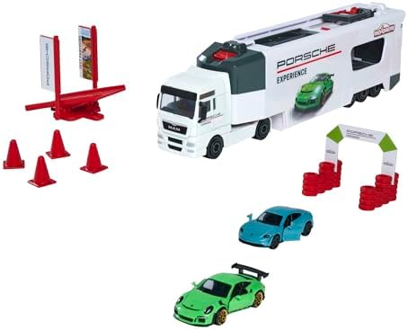 Majorette- Camión Porsche Experience 27cm, Incluye 2 Coches de Metal de 7,5cm, Partes Desplegables y Numerosos Accesorios, Adecuado A Partir de 3 Años, Color (212053304)