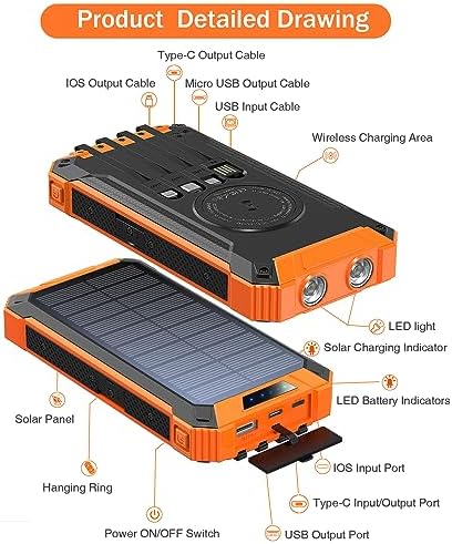 [Built-in 4 Charging Cables] This power bank is built with 3 output cables ( Type C*1 & iOS*1 & Micro USB*1) and 1 USB-A input cable. No matter output or input, you don’t need to carry charging cables. Get rid of messy cables, charge at anytime and everywhere. [Advanced Wireless Charging] This portable charger supports advanced wireless charging, compatible with all wireless-enabled devices. Such as iPhone 14/13/12 series, Samsung Galaxy S23/S22/S21 series, etc. Put your device on the wireless charging area, it gets charged immediately. Come and enjoy your cable-free charging time. [Power 6 Devices at Once] This solar charger is also equipped with 4 ports (iOS input, USB A output, USB C input/output), providing 5V/3A high-speed charging to save time. Along with 4 charging cables and wireless charging, it supports charging 6 devices simultaneously. Keep all your devices alive. Sharing with families and friends is perfect. [Super Large Capacity] With 36000mAh premium Li-polymer battery, this solar power bank can charge your devices multiple times. It can be recharged via adapter and solar power, free your worries of poweroff. Equipped with smart protection IC chip, it guarantees charging safety intelligently. [Sturdy&Durable Design for Outdoor] This solar battery pack is well made to be Waterproof/Shockproof/Dust-proof, which can withstand the harsh environment outdoors. It’s equipped with Dual super bright LED lights, a Must-Have tool for outdoor activities and home emergencies. [Thanks for choosing us] Every GOODaaa product is certified safe and provided with a lifetime warranty. We also provide professional pre-sales and after-sales service for you. Any questions, please feel free to contact us. We promise you a satisfactory solution within 24 hours.