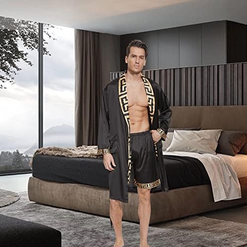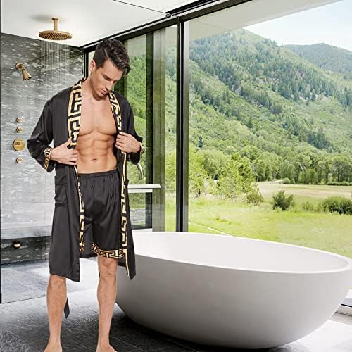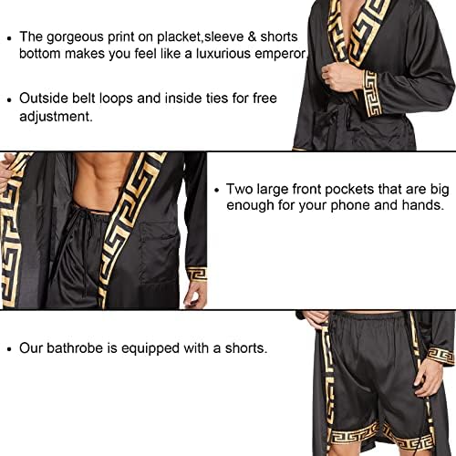 N&D Eyong Men's Luxurious Silk Feeling Bathrobes Long Sleeve Satin Kimono Robe with Shorts Sleepwear Set Printed Bathrobes