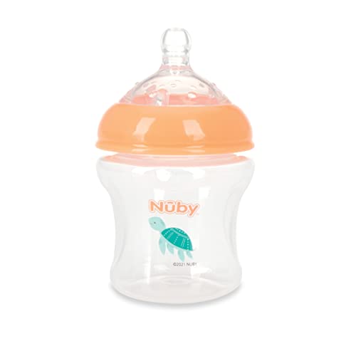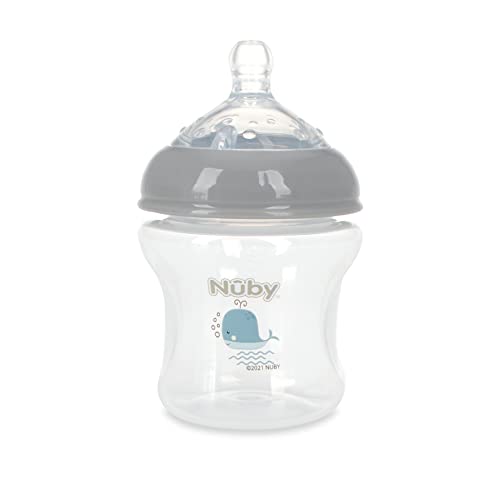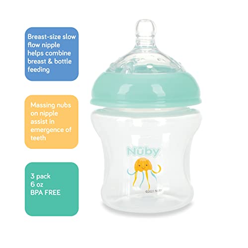 Nuby 3-Pack Infant Feeding Bottles with Slow Flow Breast Size Silicone Nipple: 0+ Months, 6oz, 3 Pack Set: Delicate Whale, Jellyfish, Turtle Prints