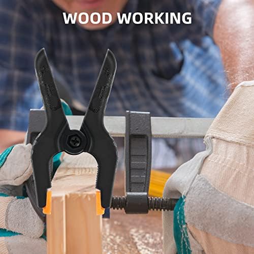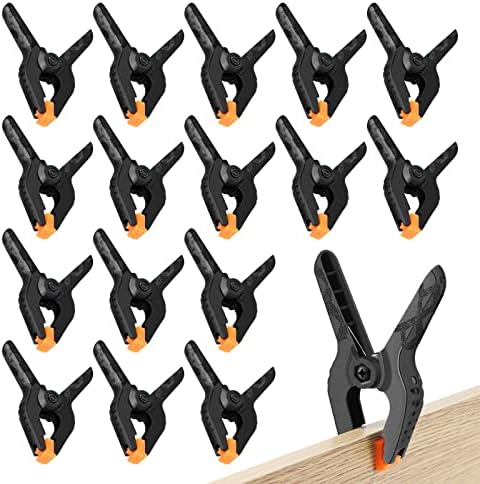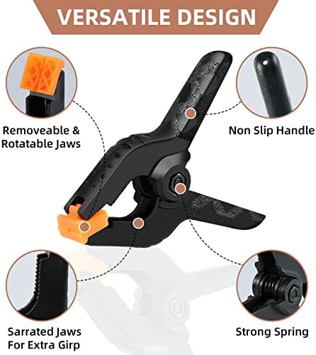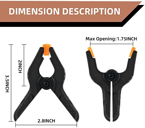 Package:16pcs 3.5 inch small spring clamps heavy duty.The dimensions of these clamps for backdrop stand is 3.5"x2.9".Backdrop clips clamps for versatile use in crafts DIY projects and photography.Whether you're a professional photographer or a hobbyist, these heavy duty clips backdrop clamps are essential for achieving a seamless backdrop display. High Quality:The small heavy duty clamps is made of durable nylon plastic with two flexible pads.The rugged construction of these spring clips for backdrop stand can help clamp items firmly and lasting performance for longer life. Excellent Design:The pads in the heads of heavy duty clips are designed to be soft and flexible to protect finishes and provide maximum flexibility and tension.The flexible orange pads of the small clamps for crafts can rotate different degrees to adjust different objects,can be removed.The plastic clamps have high strength spring whose force is about 3.5lbf clamps heavy duty. Performance:The heavy duty clamps for backdrop stand have human engineering handle,anti-slip and reduce hand fatigue to better operation. The heavy duty clip is usually use for photography. And the backdrop clips clamps very suitable as wood clamps for gluing woodworking with the great bite force.As pool cover clamps for above ground pools,the small clamp has great power to clamp the pool cloth. Satisfaction Guarantee:Bringing you premium products is the first purpose of our work. If you are not satisfied with our strong clips, please feel free to contact us and we will propose a solution that will 100% satisfy you.