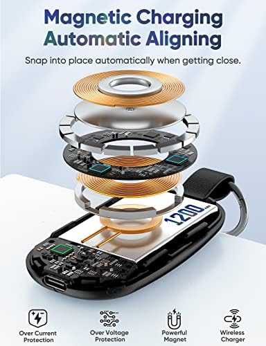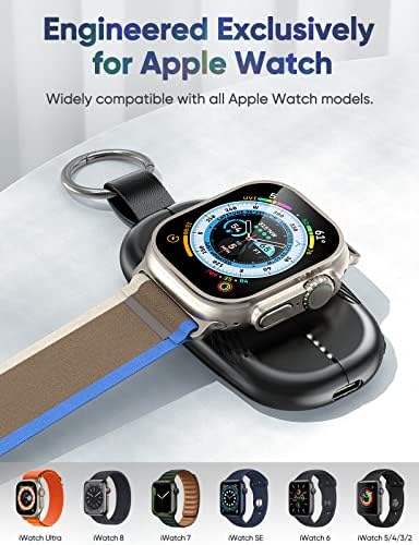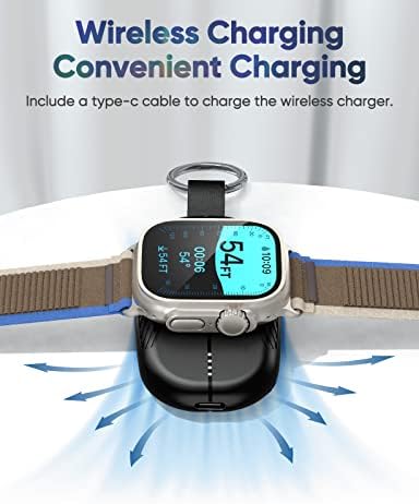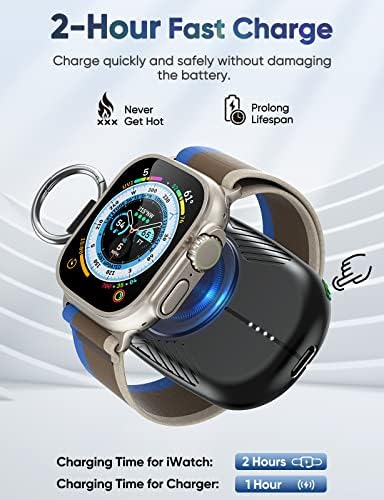 Magnetic Power Bank for Wireless Charging. Built-in 1200mAh battery offers 2-3 times of charge for your watch. Magnet design enables the apple watch charger to align correctly and start charging instantly once the magnetic charger gets close to the back of the iWatch. Charge your iWatch wherever and whenever you want without connecting to cables. Widely Compatible with Apple Watches. the iWatch charger is compatible with Apple Watch 45/44/42/41/40/38mm, including Apple Watch Series Ultra,SE,9, 8,7, 6, 5, 4, 3, 2,Apple Watch Sport, Apple Watch Nike, Apple Watch Hermes, Apple Watch Edition. Fast Charging Speed, Less Time on Waiting. With the inbuilt intelligent chip - the newest 2023 version, the iWatch charger fully charges your watch in 2 hours, half an hour faster than the included Apple Watch magnetic charging cable. Check the battery level (0-25%-50%-75%-100%) of your Apple Watch power bank with 4 LED indicators on the device. Portable Charger for Convenient Charging. Our Apple Watch keychain charger features a tiny size, portable and compact design, making it possible and convenient to carry around for daily or travel use. Slide the car key-sized wireless charger to your pocket/wallet, or clip it onto your key ring or backpack zipper to avoid dropping it accidentally. Safe Charging with Multiple Protection. Never worry about the charging safety. We’ve got you covered with over current, over-voltage, short circuits, and over-temperature protection inside the Apple Watch charger portable, which creates a safe charging environment for both your iWatch and wireless charger and prolongs the battery lifespan as well. Multiple charging methods: This charging bank supports multiple charging methods, including wireless charging and USB charging, to meet the needs of differeMultiple charging methods: This charging bank supports multiple charging methods, including wireless charging and USB charging, to meet the needs of different consumers. You can choose the charging method that suits your needs for more convenience and speed.nt consumers. You can choose the charging method that suits your needs for more convenience and speed.