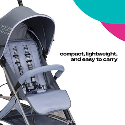 COMPACT AND LIGHTWEIGHT Getting around is easy-breezy with the Cosco Kids Simple Fold Compact Stroller. It’s lightweight, easy to carry, and when you’re done strolling, it folds with one hand and stands on its own. PLENTY OF STORAGE The extra-large storage basket gives parents tons of room to pack up everything they need to haul for a day out with their kiddo. ADDITIONAL FEATURES YOU’LL LOVE Comfy foam-grip handles. Adjustable recline and 5-point harness system. Bumper bar detaches from either side for easy in and out. Holds a child up to 45 lbs. MADE USING RECYCLED MATERIALS This stroller was designed with fabrics made using recycled materials.