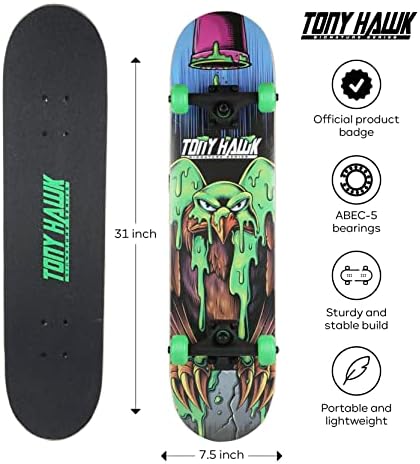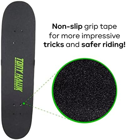 Perfect for All Riders: This 31 inch skateboard gives you just the right balance of convenience, safety, and stability. Portable and lightweight: Thanks to a sturdy wooden build coupled with the lightweight, our skateboard for cruising makes the perfect companion for your outdoor trips and travels; it's easy to carry around making it ideal for anyone that wants to skate anywhere they want Sturdy and stable build: The complete skateboard deck is made using durable and sturdy maple wood to add strength and stiffness while also gives it a stylish flair; it offers more traction for your feet and gives better control when skating Tony Hawk Signature Series: The skateboard is suitable for all skill levels and part of the Tony Hawk Signature Skateboard Series. The skateboard provides just the right fit for Cruising, Carving, Free-Style, Downhill, and more while staying stylish the super cool graphics. Thoughtful gift idea: If you're looking for a gift for family and friends that like to skate then our wooden cruising skateboard has you covered; it makes the perfect gift for Christmas, Birthdays, New Year's, Thanksgiving, and any other occasion you have in mind