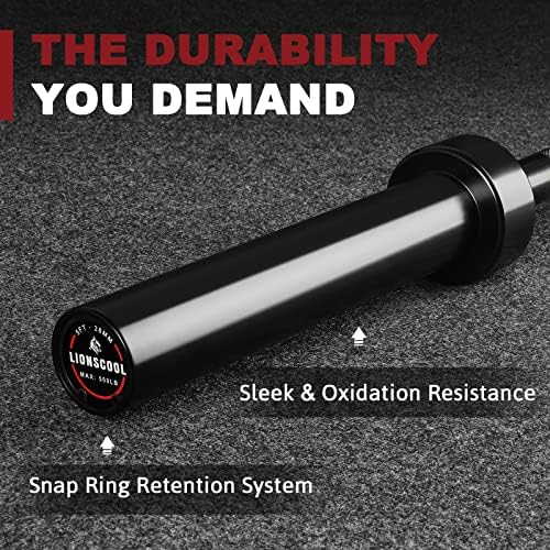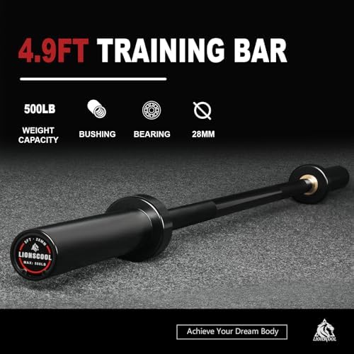 Commercial Quality for Home & Gym: Made of the same material as our Olympic barbells, our heavy duty 4.9 ft training bar will stand the test of time. The high-quality seamless steel was heat-treated to reach the weight capacity of 500LBS. The shaft and sleeves feature a unique black E-coat finish, delivering superb corrosion and oxidation resistance over time and a look that is stylish and aesthetic in your home gym. Outstanding Spin: Extra thick brass bushings and premium bearings in the sleeves makes for buttery smooth rotation. Snap ring retention system secure all the components of the sleeves for a lifetime. No more tightening the hex bolt end sleeves constantly. Medium-Depth Knurling Provides Better Grip Feel: 1.5mm deep diamond knurling with specially trimmed top offers enough gripping power while delivering comfortable grip feel. 28mm diameter shaft is easy to hold and one knurl mark at either side helps to place your hands at correct positions. Specifications: Full length is 58” (4.9ft); Weighs 28LBS; 500 pounds weight capacity; 87,000 PSI tensile strength; 28mm handgrip diameter; No center knurl; No knurl marks. Shaft length is 33.9’’; Loadable sleeves are 10.4” long and 2” in diameter to fit Olympic weight plates. Excellent Performance in All Your Workouts: It is perfect for daily strength training and bodybuilding exercises that can be performed without the need of a power cage - bicep curls, upright rows, bent over rows, deadlifts, presses, hip thrusts, HIIT workouts, etc. Also, with its sleek all-black design, it is a gorgeous equipment for limited space home gym. Buy with Trust in LIONSCOOL: We trust the durability and strength of our barbell so much that we provide a LIFETIME WARRANTY against bending on our barbells, and we always stand by the quality of our products and offer excellent customer service you expect. Just buy with confidence! The bar also comes with a workout poster; spring collars not included. It is definitely the “Bang for Buck” bar for sure.