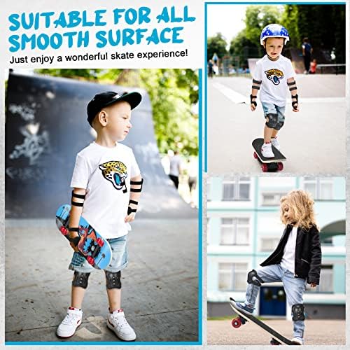 Ideal for Kids: our toddlers skateboard measures about 17 x 5 inches/ 43 x 12.5 cm, and only weigh about 1.76 lbs, with a bearing capacity of up to 33 lbs; Our bike safety gear kids include 2 pieces of knee pads, 2 pieces of elbow pads and 2 pieces of wrist guards in small size, applicable to kids Safe and Protective Gear: our protective bike gear kids are designed with adjustable elastic bands, comfortable and quick to wear, and provide good protection during sports; Its EVA foam material is light and breathable, nice for impact buffering, meanwhile making cool air flow and limiting sweat, bringing children a better use experience Reliable Material: our baby skateboard is mainly made of maple, firm and thick material, with adoption of PVC and PU wheels, reinforced with aluminium alloy post for further fixation, which can offer you with better balance control and shock absorption, nice for street and sidewalk cracks for a smooth sliding and riding experience Sweet and Distinctive Gifts: our skateboard pads and skate board for toddlers are practical, yet bringing more fun, and they are warm presents for your babies on children's Day, birthdays, Christmas, parties and other activities, and they will be very surprised and deeply touched Cool Design: our skate board for toddlers is printed with a beach pattern, adopting heat transfer printing process for long term use, waterproof without fading, no need to assemble; Our safety gear comes in classic blue and white color, making your kids dress up as a cool boy or girl when playing; They are ideal for roller skating, cycling, ice skating, rolling, ATV, BMX and other sports activities
