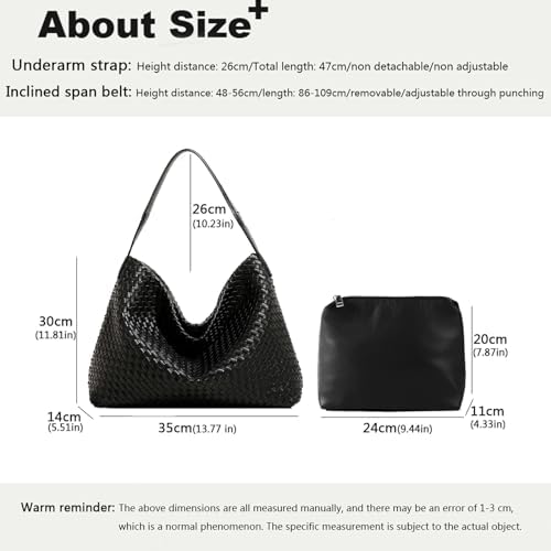 【Vegan Leather Tote ! Stand The Test of Time】Our woven bag is made of high quality vegan leather instead of animal skin, No animals are harmed and it is good for the environment. simple weave elements can better reflect the advanced design style. Delicate woven detailing runs throughout the frame. it's light and practical. It is suitable for daily carry and can carry the items you need for travel. You will get 1 x handbag and 1 x clutch in your order. 【Shoulder bag dimension】Handbag size: 13.77" L x 5.51" W x 11.81" H, Handle drop: 10.23" . Clutch size: 9.44" L x 4.33" W x 7.87" H.Simple and spacious utilitarian design with a adjustable strap,removable and punching adjustment . The tote handbag can be loaded into mobile phones, earphones, power banks, cosmetics, masks, keys, folding umbrellas, water bottles and other daily carrying items. The clutch bag can hold personal items such as coins, cash, etc.to meet your different needs. 【Best of The Best Design】It can be used as a shoulder bag, handbag and crossbody bag, with a comfortable and soft handle, and its armhole is big enough to match your shoulders. Elegant and unique hand-woven texture, it is simple, stylish and effortlessly matches everything in your wardrobe. It represents the easy, laid-back, free and slow-paced life, and it is a symbol of our pursuit of a better life. 【Multiple Occasions】You can take it to work, dining at restaurants, watching movies, traveling, shopping, going on vacation, dating, beach and more.It is a good choice for everyday use. If you want to go on vacation, beach or travel then this women's shoulder handbags will be the ultimate choice for you. 【Great Gift Option】 This tote bag with metal lock catch is perfect gift for girlfriends, wife, mothers, sisters,daughter or yourself etc. Due to the influence of shooting lighting and ambient light, there is a little color difference between the picture and the eye. After adjustment, the picture is very close to the original color of the hobo bag. #114,598 in Clothing, Shoes & Jewelry ( ) #191 in
