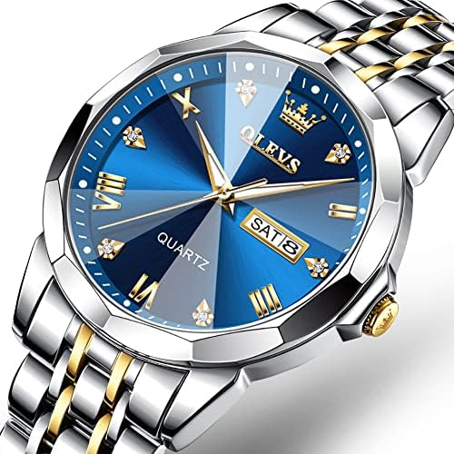 【Men's Wrist Watch:】Imported Movement, high quality quartz movement and battery provide accurate time keeping,Solid Durable and comfortable stainless steel band fits to daily wear,scratch proof mineral glass dial. 【Luxury Fashion Design:】 The blue watch for men with its rhombic coated glass mirror,bling diamond dial,stainless steel case and band, Case diameter:41mm. Case thickness:11mm. This classic fashion simple dress wristwatch will be greatly suitable for any occasion. 【316L Stainless Steel:】 Two tone strap designed to make the man watch more fashionable and luxurious, durable and corrosive, and still maintain shiny after long -term use.If it is too short, we can watch chain links for free. Provide adjustment tools to easily adjust the belt length. 【3ATM Waterproof and Luminous:】 Water resistance up to 100 feet(30 meters) which is suitable for everyday use such as daily use/rain resistant, but it cannot swim or take a hot bath.Luminous display function.When Using the Night Light Function for the first time, Illuminate the Male Watch for 30 Seconds Under the Light or adsorb the sunshine to Activate the Light Function. 【OLEVS Warranty Service: 】We provide 24 months warranty and 30-day money back guarantee.If you have any problems during the use of the business watch, please contact us at any time. We will provide you with professional services