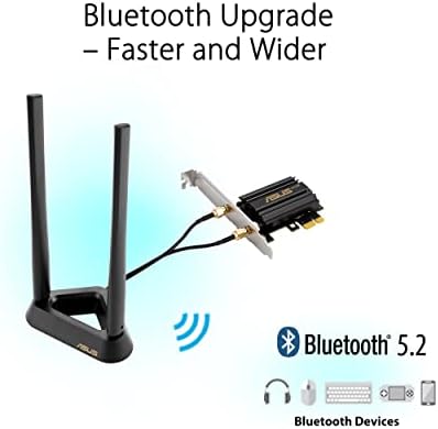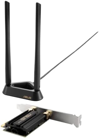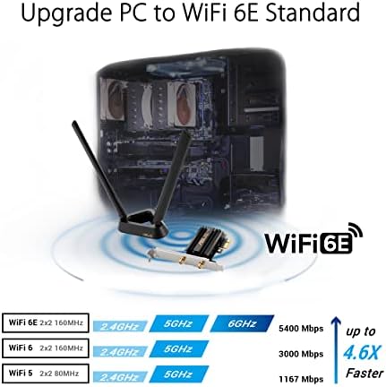 ASUS WiFi 6E total solution - optimized capabilities and performance All-new 6 GHz band - Less congestion and interference for WiFi connections Latest Bluetooth 5.2 - improved signal range, faster transmit speeds and less interference Ultrafast WiFi 6 & WiFi 6E – 4.6X faster speeds, improved connection efficiency and better network security Reduced dead zones with external antenna - Freestanding transceiver and connecting cable allows easy positioning for the best reception