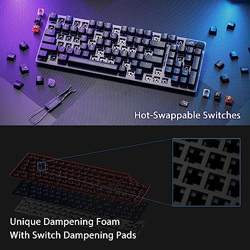 96% layout: Retains all function and number keys in a more compact and efficient layout that frees up desk space Hot-swappable switches: Pre-lubed NX Snow linear switches and ROG NX Storm clicky switches with walled stem design to enhance keystroke stability and are tuned for great acoustics Tri-mode connection: Connect using Bluetooth (up to three devices), 2.4 GHz with ROG SpeedNova wireless technology or wired USB Sound-dampening foam with switch-dampening pads: Unique, integrated dampening foam with added switch-dampening pad structure absorbs pinging noises and echoes for improved keystroke acoustics. Enhanced typing experience: Pre-lubed keyboard stabilizers produce less friction for smoother keystrokes and stability for longer keys; durable ROG PBT doubleshot keycaps or UV-coated ABS keycaps offer a premium feel and shine resistance Hotkeys: F1–F5 keys are pre-programmed as hotkeys for Xbox Game Bar and recording Intuitive controls: Multi-function button and multi-wheel for media playback, volume, and keyboard lighting