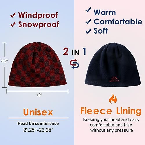 ULTIMATE COMFORT AND STYLE:The winter beanies made of durable knitted material on the outside and lined with soft thick fleece on the inside, keep your head and ears for maximum warmth and comfort, and the newly upgraded knitted construction provides good insulation, featuring a plaid design, is a trend-setting accessory for your casual wearing or formal attire CRAFTED HIGH QUALITY KNITWEAR: A unique 3D stereoscopic cut that provides a comfortable feel for our heads, the hexagonal design at the top of the beanie ensures that the fabric is tight and seamless, making it withstand the test of long time and harsh environments. New developed technology, precisely controlled by computer, to obtain the most beautiful and consistent sewing quality, ensuring that all beanie hats are excellent FLEXIBLE AND STYLISH:Another highlight of this beanie is its reversible design. You can wear it on either side, and one beanie hat gives you two stylish options. The plaid patterned side adds a stylish and modern feel to your look, while the solid color side provides a classic yet understated style MORE DYNAMICS FOR WINTER SPORTS: This fleece lined beanie are not only stylish and practical, but also suitable for all kinds of winter outdoor activities. The snug fit and excellent stretchy fabric allow for dynamic movement, and whether you're skiing, running, hiking, or just strolling through the park MATURE AND VERSATILE GIFT: This beanie is a practical and bright choice for birthdays, holidays or any special occasion. Don't let the cold weather dampen your spirit, embrace it with confidence and style. Upgrade your winter wardrobe with our men's and women's beanie hats and experience the ultimate combination of function and style #569,318 in Clothing, Shoes & Jewelry ( ) #1,370 in #1,531 in