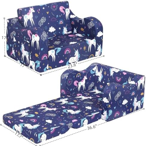 Rainbow Unicorn Printed: Add a touch of charm and enchantment to kids' freedom space with our so-soft kids sofa featuring magical unicorns. Kids Friendly Design: The comfy kids chair is lightweight for kids to move to any room they want, whether its reading, playing video games, watching tv, or just relaxing, children can play with this sofa as they please. Kids Convertible Sofa: The Kids Chairs is perfect for kids sitting and reading or watching their favortie cartoon. During nap time this sofa chair folds out into a comfy nap pad. Toddler Couch Safety and Reliability: The kids sofa chair is made of durable soft polyester that is easy to clean and is filled with premium foam to support kid's body. The sofa is designed with safety in mind, as there are no sharp corners or hard edges.