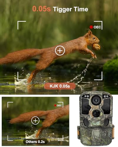 Innovative Wi-Fi Connection + APP Control: This trail camera is compatible with 2.4 GHz Wi-Fi and ultra-low power Bluetooth technology, the dedicated free and simple-to-use App (“TrailCam GO”) allows you program your camera, and check videos or pictures without having to download them first. Additionally, it comes with a 64GB SD card and 8 AA batteries, ensuring optimal storage right out of the box. 84MP Still Image & 8K H.264 MP4 Video: Thanks to a state-of-the-art image sensor and premium starlight optical lens, this game camera excels at capturing sharp and highly detailed still images at 84MP. Additionally, it records high-resolution UHD 8K video with audio, ensuring it captures wildlife moments in a more detailed, clear, and vivid manner. Stealthy Night Vision: Our enhanced 42-piece 950nm No-Glow LED array boasts invisible detection capabilities and incorporates adaptive illumination technology to prevent overexposure or excessive dimming. This ensures the trail cam produces clear night images and videos in complete darkness without causing any disturbance to the surrounding wildlife. 0.05s Trigger Time &130°Wide Angle: Coupled with a lightning-fast 0.05-second trigger speed and a selectable 1-5 Photos Per Trigger, the KJK228 trail camera ensures you'll never miss the action, combined with 130° Wide Angle PIR Detection and a 100ft detection distance to give you an expansive field view. The custom camo pattern blends perfectly into the environment. Upgrade IP67 Waterproof: The KJK228 trail camera is IP67 waterproof and dustproof, thanks to the compact and sturdy housing design and a high-quality rubber ring, ensuring that works normally from -22 °F to 158 °F, excellent quality can be used in a variety of environments, such as deserts, rainforests, etc, make an excellent gift for wildlife enthusiasts, avid hunters, and outdoor enthusiasts.