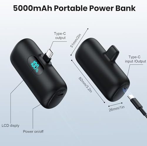【Portable Charger with the Built-In USB-C Connector】this power bank is widely compatible with iPhone 15/15 Plus/15 Pro/15 Pro Max, iPad Air (4th/5th Gen), iPad Pro 11-in. (1st/2nd/3rd/4th Gen), iPad Pro 12.9-in. (3rd/4th/5th/6th Gen), iPad mini(6th generation), iPad(10th Gen), AirPods Pro(2nd Gen), Samsung Galaxy S22/S23,Google Pixel, LG,Moto and other Android devices with USB C charging port. 【Ultra-Compact Portable Charger】 this mini portable charger size is only 3.2x1.96x1 inch, Super small and lightweight. You can put in your pocket, clutch bag or purse easily. 【PD Fast Recharging and Smart LCD Display】This mini iPhone15 battery pack support PD quick speed charging,fully recharge this mini portable charger about 2-3 hours. Smart LCD display clearly show the remaining battery left. 【5000mAh Emergency Battery Backup Charger 】This power bank is 5000mAh Capacity,normally 0.9 charge for your iPhone 15, Which is very suitable as a backup power supply for daily use,keeping your devices powered up wherever you go. 【What You Will Get】USB-C portable charger x 1, USB-C charging cable x 1, User manual x1. and 2 Years warranty lifetime technical support. Any questions, please kindly contact us anytime. 【Tips for Charging through Phone Case】This portable charger is compatible with phone case thickness less than 4MM. If your phone case thickness is beyond 4MM, the USB-C port can not plug into charging slot, you need to remove your phone case.