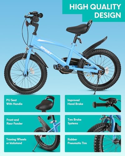 【Design for Kids 】1. This 16 inches kids bike comes with stable training wheel early. 2.Quick release seat simplify the height adjustment. 3.Saddle with holder to learn riding when the training wheel is off. 4.Foot brake suitable for young rider don't have enough power to manipulate the hand brake. 【Safe for Kids】Our kids bike bell around the handle and reflectors in many places, making it easy to drive during the day and at night. Detachable training wheels allow your child to ride a bicycle smoothly from beginner to being able to ride. Fully-enclosed Chain, effectively prevent clothing and other things involved in the chain resulting in child injury. 【Minimum Maintenance 】Made of premium steel to survive the bumps of learning, the durable steel frame is backed by our limited lifetime warranty. The kids bike comes with black tire & single speed, only little maintenance needed due to the simple design. 【Easy to Install】The 16" kids bike comes with 85% Pre-assembled body and the basic assembly tools, only pump needed for tire, normally takes a novice about 20 minutes to assemble the bike. If you have problem about assembly the bike, please contact us. 【Ideal Gift Choice】The kids bike with training wheels is perfect for beginner riders 41"-46" tall. Helping boys and girls age 4 to 10 years old learn to ride with confidence and fun.