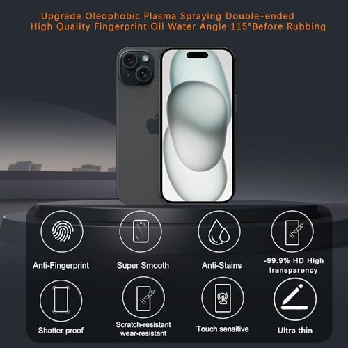 ? Why Choose Our iPhone 15 Screen Protector? Screen protector has an unique anti-static coating function design,can reduce the generation and impact of static electricity to a certain extent. Avoid the impact of static electricity on your phone. Also enhance the scratch-resistance and anti-fold strength of your phone screen.Effectively protecting your phone screen from being scratched or broken.With this screen protector can protect your precious phone! ? Packaging & Perfect After-Sales - You will get 3 Pack*glass screen protector + 3pcs*Cleaning Wipes(Dry) +3*Cleaning Wipes(Wet) +3 dust removal stickers.Screen protector compatible with iPhone 15 6.1 inch display screen protector.If you have any questions about screen protector tempered glass,please free to contact us. We will reply to you as soon as possible to help you solve it. ? High Hardness & Scratch-Resistant & Shockproof & Anti-Fingerprint & Impact Resistant - Screen protector -1.High quality 9H high hardness screen protector,15X stronger stronger than traditional screen protection.Defend shattered edges,explosion,against drops,dings and scratches.2.Hydrophobic and oleophobic coating effectively prevents fingerprints, dust, oil,smudges, and watermark from gathering on the screen.Offers you a clean and clear screen environment.3.Rounded edge design,An arc exceeding 120°,Touch smooth.Won't scratch your hands.4.Can Bending:210°,With maximum protection. ? Touchscreen Sensitive & Ultra HD Clarity & Care for Your Eyes - Screen protector 0.33mm ultra-thin screen protector makes you true touch sensitivity and ensures accurate and work quick typing,smooth game and video playing.maintaining the same responsiveness,original ultra HD picture quality and touch experience as a naked phone.Transmittance rate over 99.99% optical grade transparency.Even after hours of video or gaming consumption, without eyestrain or blurry vision. Your eyes are always protected!Perfect experience make you to enjoy the process of playing with your phone! ? Easy to install & Save Time & Save Energy - Iphone 15 tempered glass screen protector 30-second installation process.Just remove dust and align it properly before installation advanced silicone adhesive,no residue when removing no worrying about bubbles. iPhone 15 protective film keep your phone looking new no matter how long you use it!