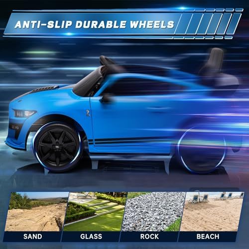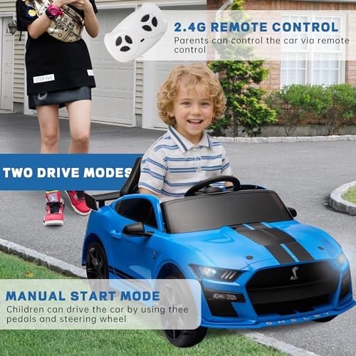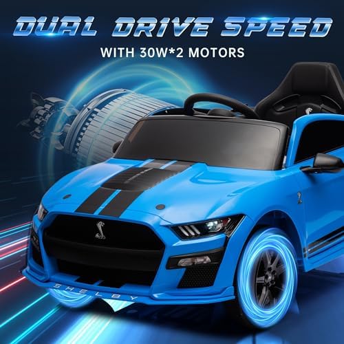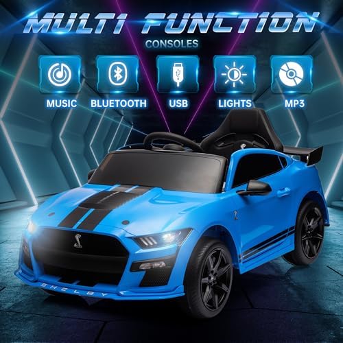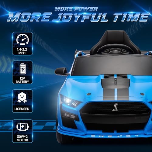 OKYBABY 12V Licensed Ford Mustang GT500 Ride on Car Toys, Electric Car for Kids W/Remote Control, Electric Vehicle with Bluetooth, Radio, Music, USB Port, LED Lights, Blue