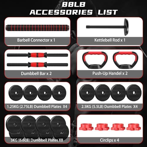 ▶【Versatile Training Equipment】: 4 in 1 adjustable dumbbell set can elevate your home workouts. Ingeniously designed to convert into dumbbells, barbells, kettlebells, and push-up stands, it's the ultimate versatile equipment for a wide array of strength exercises. ▶【Innovative Design】: The unique plates prevent rolling, enhancing safety and allowing for seamless transitions between exercises. This design ensures your workout space is efficient, and your routine is uninterrupted. ▶【Premium Quality & Durability】: Crafted with eco-friendly PE material and a robust cement and iron sand mixture, the 4 in 1 adjustable weight dumbbell set promises durability and precise weight for a focused workout session every time. ▶【Ergonomic Comfort & Secure Grip】: The dumbbells adjustable weight set is designed for a non-slip, secure grip and comfort that adapts to the natural contours of your hands and neck because of it's an ergonomic, foam-padded bar and upgraded anti-loosing nuts design. ▶【Adjustable Weight for Progressives Training】: It is great for diverse exercises and progressives training, ensuring your fitness evolves. Cater to your fitness level with our adjustable weights, dumbbell: 5-44lbs, barbell: 5-88lbs, kettlebell: 2.5-26lbs.